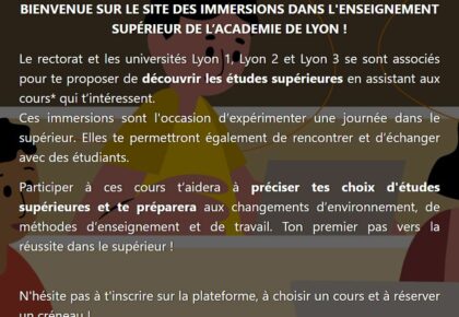 1 jour dans le sup La nouvelle plateforme « 1 jour dans le sup » permet aux lycéens de bénéficier d’immersions dans l’enseignement supérieur. La plateforme permet aux élèves de s’inscrire à des cours (cours magistraux, travaux dirigés…) dans les universités Lyonnaises sur https://lyon.immersup.fr/. Les...