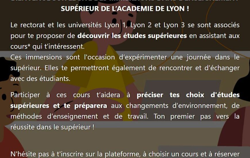 1 jour dans le sup La nouvelle plateforme « 1 jour dans le sup » permet aux lycéens de bénéficier d’immersions dans l’enseignement supérieur. La plateforme permet aux élèves de s’inscrire à des cours (cours magistraux, travaux dirigés…) dans les universités Lyonnaises sur https://lyon.immersup.fr/. Les...